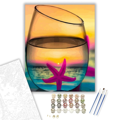 Tengericsillag - számfestő készlet – 40×50 cm (Keretre feszítve) A festmény a naplemente varázslatos hangulatát idézi elő, ahol a tengericsillag finoman lebeg a pohárban. Egy romantikus történet bontakozik ki a háttérben, ahogy a nap utolsó sugarai elérik