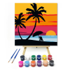 Tengerpart - gyerek számfestő készlet – 20×20 cm (Keretre feszítve) Ezen a képen egy varázslatos tengerparti naplemente látható, ahol a pálmafák alatt egy napernyő és egy nyugágy hívogat pihenésre. A naplemente színei melegséget árasztanak, miközben a kék