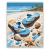 Tengerparti Flip-Flop Nyár - számfestő készlet – 40×50 cm (Keret nélkül) A festmény egy pár flip-flopot ábrázol, amint a homokban hevernek, apró kagylókkal és tengeri csillagokkal körülvéve, miközben a tenger lassan közeledik. A kép színvilága élénk kékek