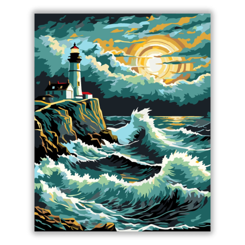 Tengerparti Világítótorony Látomás - számfestő készlet – 40×50 cm (Keret nélkül) A kép egy drámai tengerparti jelenetet ábrázol, ahol a vad hullámok és a fenséges világítótorony találkozik. A gazdag kék és zöld árnyalatok, valamint a lendületes ecsetkezel