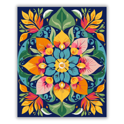 Természet Ihlette Mandala Virágokkal és Levelekkel - számfestő készlet – 40×50 cm (Keret nélkül) A festmény egy bonyolult, természet ihlette mandalát ábrázol, amelyen levelek és virágok jelennek meg. Az élénk, merész színek, mint a kék, narancs, sárga és