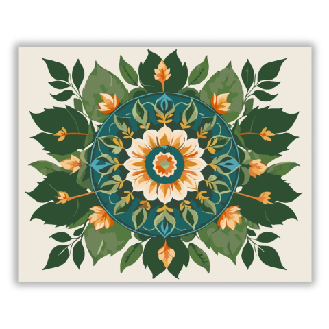 Természet Mandala Levelekkel és Virágokkal - számfestő készlet – 40×50 cm (Keret nélkül) A festmény egy természet ihlette mandalát ábrázol, amely levelekkel és virágokkal díszített. A zöld, narancs és kék színek kombinációja friss, harmonikus hatást kelt.