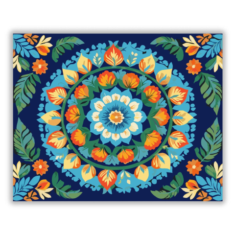 Természet Mandala Virágokkal és Levelekkel - számfestő készlet – 40×50 cm (Keret nélkül) A festmény egy természet ihlette mandalát ábrázol, amely levelekkel és virágokkal van díszítve. Az élénk színek, mint a narancs, kék és zöld, dinamikus és frissítő ha