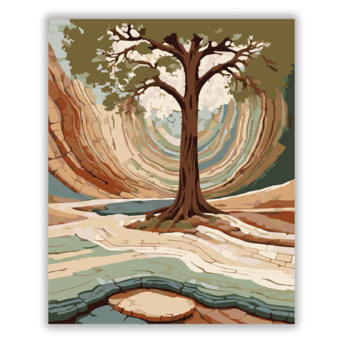 Természeti Rétegek Absztrakt Táj - számfestő készlet – 40×50 cm (Keret nélkül) A festmény egy fa sziluettjét ábrázolja, amely körül rétegesen elhelyezkedő talaj és sziklaformációk láthatók. A természetes földszínek, mint a barna, zöld és kék, nyugodt, har