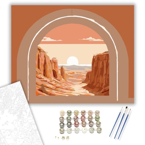 Terrakotta Naplemente Ívekkel - számfestő készlet – 40×50 cm (Keretre feszítve) A festmény egy nagy terrakotta íven keresztül mutatja a lenyugvó napot egy sivatagi táj fölött. A meleg narancs és bézs árnyalatok harmonizálnak a háttérrel, nyugalmat és mele