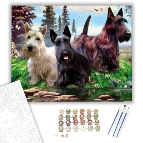 Terrierek - számfestő készlet – 40×50 cm (Keretre feszítve) A festmény egy bájos, vidám hangulatot áraszt, amely azonnal mosolyt csal az arcodra. A három terrier mintha egy kalandos meséből lépett volna elő, készen állva felfedezni a világot. A háttér zöl