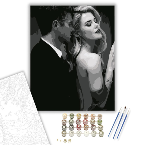 Titkos romantika - számfestő készlet – 40×50 cm (Keretre feszítve) A kép egy titokzatos és romantikus hangulatot áraszt, amely azonnal magával ragadja a nézőt. Egy elbűvölő pillanatot örökít meg, ahol a csendes intimitás uralkodik. A fekete-fehér színek k