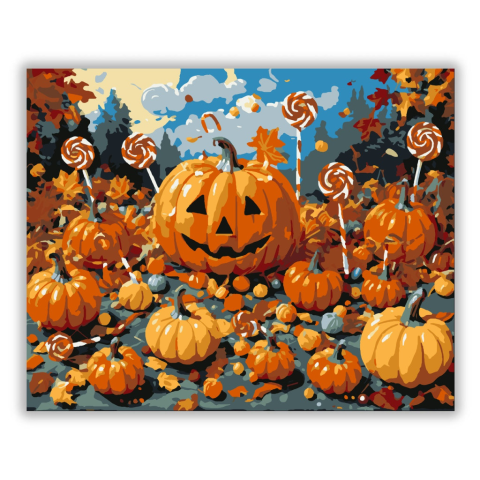 Töklámpás és cukorkák - számfestő készlet – 40×50 cm (Keret nélkül) Ez a festmény egy vidám töklámpást ábrázol, amely körül különféle édességek, cukorkák és nyalókák hevernek az őszi levelek között. A narancssárga tökök és a piros-fehér édességek színes k