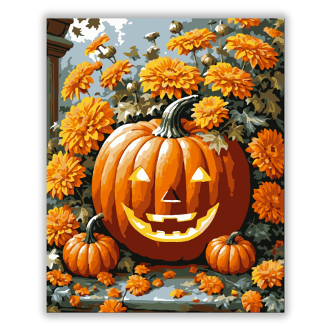 Töklámpás és virágok - számfestő készlet – 40×50 cm (Keret nélkül) Ez a festmény egy vidám töklámpást ábrázol, amelyet élénk, narancssárga virágok vesznek körül. Az őszi színek melegséget árasztanak, a virágok és a töklámpás tökéletes harmóniát alkotnak.