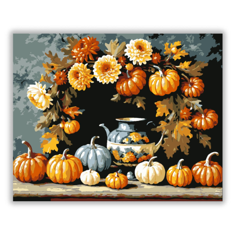 Tökös őszi koszorú - számfestő készlet – 40×50 cm (Keret nélkül) Ez a festmény egy elegáns őszi kompozíciót mutat be, amelyben dísztökök és színes krizantémok lógnak egy koszorún. A háttér sötétkék árnyalatai és a narancssárga, fehér és zöld tökök tökélet