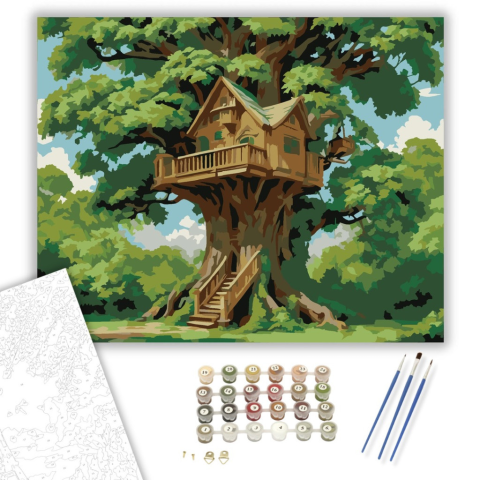 Tölgyfa Lombház - számfestő készlet – 40×50 cm (Keretre feszítve) A festmény egy hatalmas tölgyfát ábrázol, amelynek ágaiban kézzel faragott lombház rejtőzik. A zöldellő lombozat és a kúszóborostyán élénk, természetközeli színeket visz a kompozícióba. A k