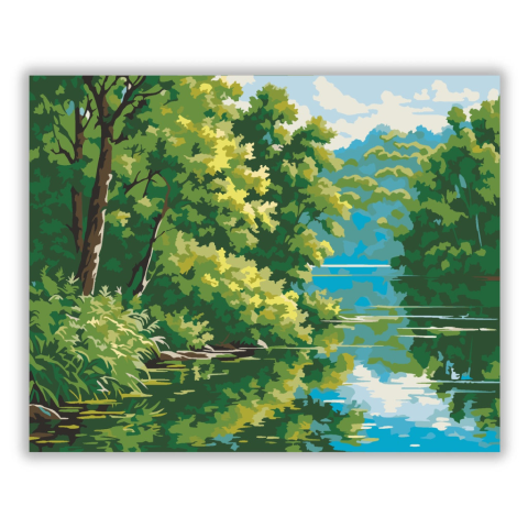 Tóparti Cserjés Nyugalom - számfestő készlet – 40×50 cm (Keret nélkül) A festmény egy sűrű növényzetű cserjést ábrázol, amely a nyugodt tóparton terül el, leveleik a lágy reggeli fényben csillognak. A zöld árnyalatok és a víz tükröződései friss, tavaszi h