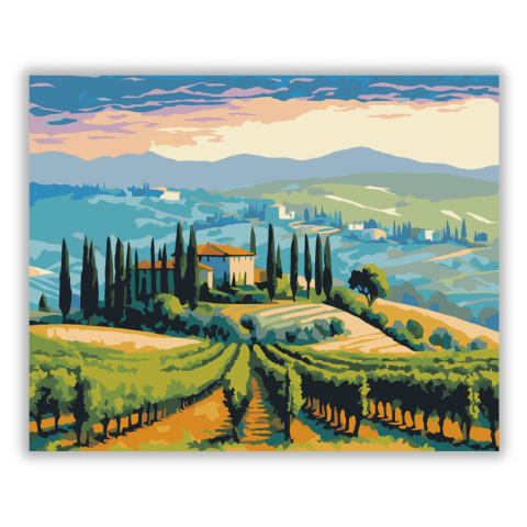 Toszkán Dombok és Villa - számfestő készlet – 40×50 cm (Keret nélkül) A festmény Toszkána dombos táját ábrázolja, ahol sorban állnak a ciprusfák, és távolban egy villa látható. A kép meleg színei, a narancs és zöld árnyalatok mediterrán hangulatot teremte