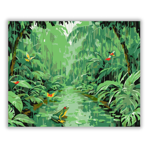 Trópusi Esőerdő Ösvény - számfestő készlet – 40×50 cm (Keret nélkül) A festmény egy trópusi dzsungel ösvényét ábrázolja, ahol a nagy zöld levelek csillognak az esőtől, miközben békák ugrálnak pocsolyák között. A zöld, sárga és piros színek élénk kontraszt