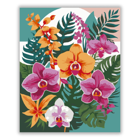 Trópusi Orchidea Mandala - számfestő készlet – 40×50 cm (Keret nélkül) A festmény egy trópusi stílusú mandalát ábrázol, amelyet orchideák és páfrányok díszítenek. A vibráló narancs, lila és zöld színek élénk és egzotikus hangulatot teremtenek. A kép friss