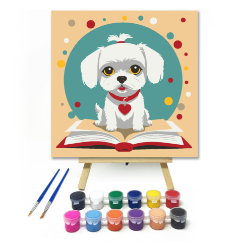 Tudós kis kedvenc - gyerek számfestő készlet – 20×20 cm (Keretre feszítve) Ez a kép egy cuki kis kutyust ábrázol, aki éppen egy könyvön üldögél és kíváncsian figyel. A színes pöttyök vidám hangulatot teremtenek körülötte. Tökéletes társ a gyerekek első kr