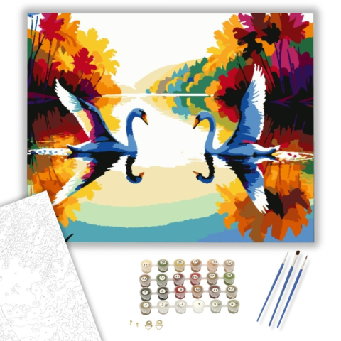 Tükröződés a Folyón - húsvéti számfestő készlet – 40×50 cm (Keretre feszítve) A kép egy nyugodt, álomszerű hangulatot áraszt, ahol a természet szépsége tükröződik. Két hattyú elegánsan úszik a folyón, mintha egy örök történetet mesélnének el az élet és a