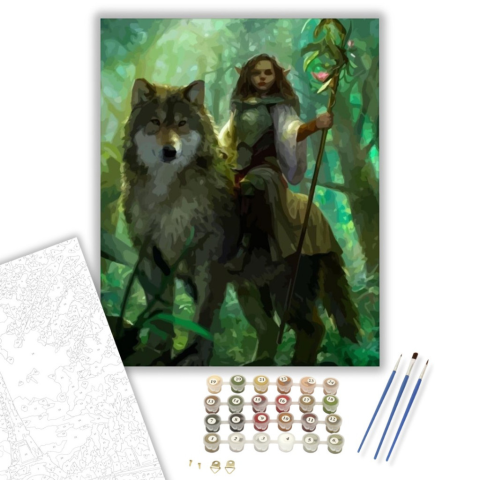 Tündék világa - számfestő készlet – 40×50 cm (Keretre feszítve) A festmény egy misztikus, varázslatos világba kalauzol, ahol a természet és a mágia harmonikus egységben él. Egy titokzatos történet bontakozik ki, ahol az erdő mélyén egy bátor alak áll őrt