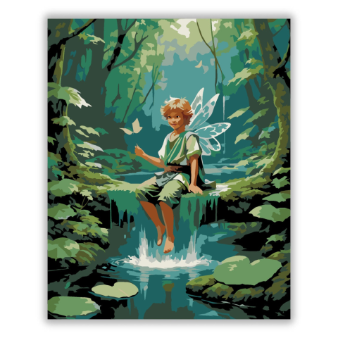 Tündérfiú a Lebegő Levélen - számfestő készlet – 40×50 cm (Keret nélkül) A festmény egy tündérfiút ábrázol, aki egy lebegő levélen ül egy kristálytiszta erdei patak felett. A zöld és kék árnyalatok békés, varázslatos hangulatot teremtenek. A kép a termész