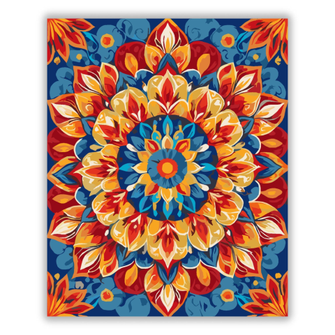 Tüzes Mandala Élénk Színkombinációval - számfestő készlet – 40×50 cm (Keret nélkül) A festmény egy tüzes, részletgazdag mandalát ábrázol, amely koncentrikus körökből és lángnyelveket idéző formákból épül fel. Az élénk vörös, narancs, sárga és kék színek d