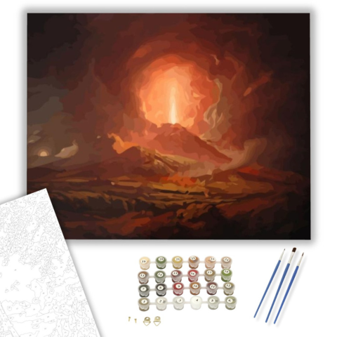 Tűzhányó - számfestő készlet – 40×50 cm (Keretre feszítve) A festmény a természet vad erejét és drámai szépségét ábrázolja, amely azonnal magával ragadja a nézőt. Egy tűzhányó kitörésének pillanata bontakozik ki, mintha egy ősi történet elevenedne meg elő