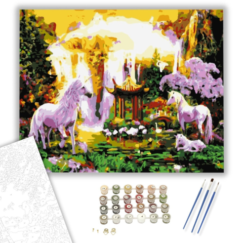Unikornis Család 2 - számfestő készlet – 40×50 cm (Keretre feszítve) Ez a festmény egy varázslatos világba repít, ahol a természet és a fantázia harmonikus egységet alkot. A kép mesés tájat ábrázol, ahol a béke és a nyugalom uralkodik. Az élénk színek és