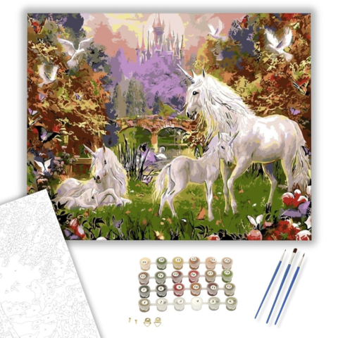 Unikornis Család - számfestő készlet – 40×50 cm (Keretre feszítve) Ez a festmény egy varázslatos világba kalauzol, ahol a képzelet határtalan. Egy titokzatos történet bontakozik ki a néző előtt, ahol az unikornisok családja békésen él egy mesebeli tájban.