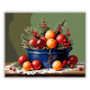 Ünnepi Gyümölcsvarázs - számfestő készlet – 40×50 cm (Keret nélkül) A képen egy mélykék edényben elhelyezett ünnepi kompozíció látható, amelyet fenyőágak, élénk piros bogyók és narancssárgás-arany almafélék díszítenek. A háttér finom zöld árnyalatai tökél