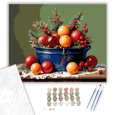 Ünnepi Gyümölcsvarázs - számfestő készlet – 40×50 cm (Keretre feszítve) A képen egy mélykék edényben elhelyezett ünnepi kompozíció látható, amelyet fenyőágak, élénk piros bogyók és narancssárgás-arany almafélék díszítenek. A háttér finom zöld árnyalatai t