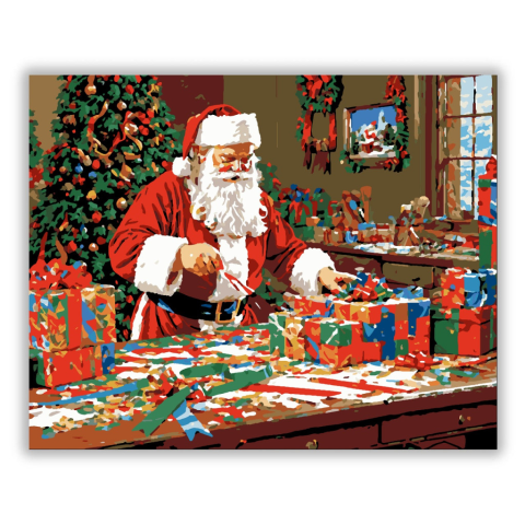 Ünnepi Készülődés a Műhelyben - számfestő készlet – 40×50 cm (Keret nélkül) A képen Télapó gondos kezeivel készíti az ajándékokat egy hóbundában táncoló, fenyőfákkal teli szobában, ahol a varázslat mindig jelen van. Az élénk piros és zöld színek ünnepi ha