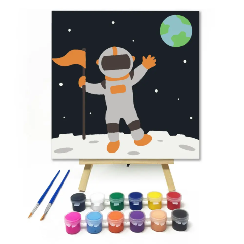 Űrhajós - gyerek számfestő készlet – 30×30 cm (Keret nélkül) Ez a kép egy vidám űrhajóst ábrázol, aki boldogan integet a Hold felszínéről, miközben a Föld mosolyog vissza rá. A csillagos ég és a színes bolygó barátságos hangulatot varázsolnak. Tökéletes v