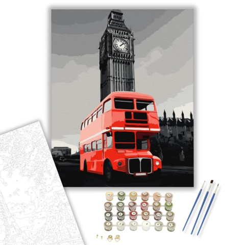 Utazás Piros Busszal - számfestő készlet – 40×50 cm (Keretre feszítve) Ez a festmény a londoni utazás nosztalgikus hangulatát idézi meg, ahol a piros busz és az ikonikus torony egy történetet mesél el a város szívében. A kontrasztos színek dinamikus energ