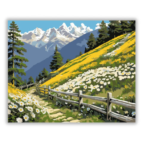 Vadvirágos Hegyi Lejtő - számfestő készlet – 40×50 cm (Keret nélkül) A festmény egy meredek hegyi lejtőt ábrázol, melyet sárga és fehér margaréták borítanak, és egy kanyargó fakerítés vezet felfelé. A színek élénkek, a sárga és zöld árnyalatok dominálnak,