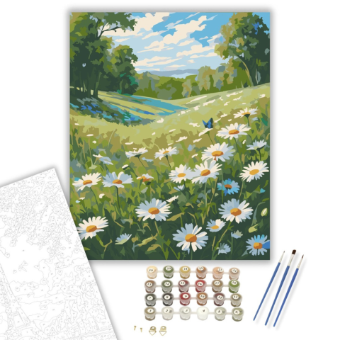 Vadvirágos Margaréta Mező - számfestő készlet – 40×50 cm (Keretre feszítve) A festmény egy álomszerű mezőt ábrázol tele vadmargarétákkal, körülöttük táncoló pillangókkal, a békés kék ég alatt. A fehér és zöld árnyalatok nyugalmat és frissességet sugározna