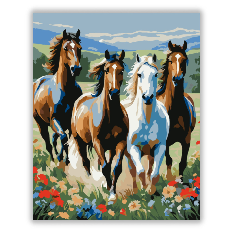 Vágtató Lovak a Vadvirágos Rétben - számfestő készlet – 40×50 cm (Keret nélkül) A festmény négy lovat ábrázol, amint együtt vágtatnak egy vadvirágokkal teli réten, sörényük és farkuk lobog a szélben. A kép élénk színei és kontrasztos árnyalatai dinamikus