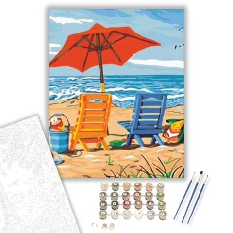 Vakáció - számfestő készlet – 40×50 cm (Keretre feszítve) A festmény nyugodt, tengerparti hangulatot áraszt, amely a pihenés és kikapcsolódás pillanatait idézi. A háttérben a tenger hullámai halkan morajlanak, míg az élénk színek életre keltik a jelenetet