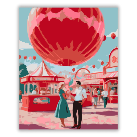 Valentin-napi Randevú Vidámparkban - számfestő készlet – 40×50 cm (Keret nélkül) A festmény egy szerelmespárt ábrázol, amint vidámparkban osztoznak egy pamutcukron, egy nagy piros lufi ív alatt. A kép élénk piros és kék színekben pompázik, vidám és játéko
