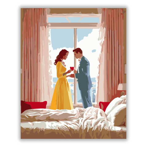 Valentin-napi Szerelmespár a Hálószobában - számfestő készlet – 40×50 cm (Keret nélkül) A festmény egy párt ábrázol, amint Valentin-nap reggelén szerelmes levelet cserélnek a hálószobában, a napfény beárad a függönyökön át. A lágy pasztellszínek és a mele