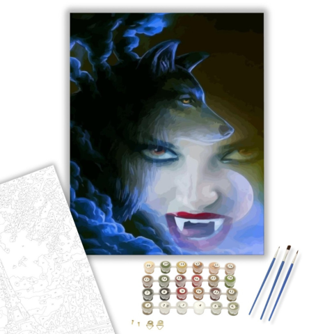 Vámpírlány és farkas - számfestő készlet – 40×50 cm (Keretre feszítve) Ez a festmény misztikus és izgalmas légkört teremt, amely azonnal magával ragadja a nézőt. Egy titokzatos történet bontakozik ki, ahol a vámpírlány és a farkas összefonódnak egy éjszak