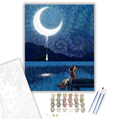 Van Gogh estje - számfestő készlet – 40×50 cm (Keretre feszítve) A festmény egy varázslatos éjszakai jelenetet tár elénk, ahol a holdfény titokzatos táncot jár a víz felszínén. Két alak ül csendben a mólón, mintha egy különleges történetet osztanának meg