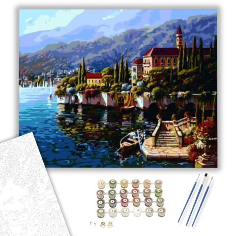 Varennai dokkok - számfestő készlet – 40×50 cm (Keretre feszítve) A festmény nyugodt, mediterrán hangulatot áraszt, amely azonnal magával ragadja a nézőt. Egy eldugott kisváros történetét meséli el, ahol a múlt és a jelen harmonikusan találkozik. A kék ví