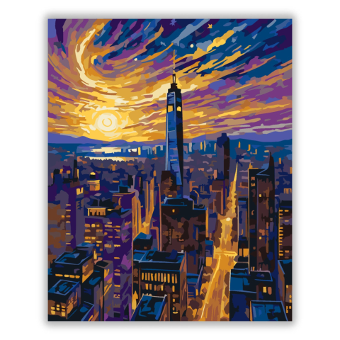 Városi Csillagfény Éjszakája - számfestő készlet – 40×50 cm (Keret nélkül) A kép egy éjszakai városi tájat ábrázol, ahol a fények és az égbolt dinamikus ecsetvonásokkal keverednek. A lila és arany színárnyalatok kontrasztja, valamint a lendületes ecsetkez