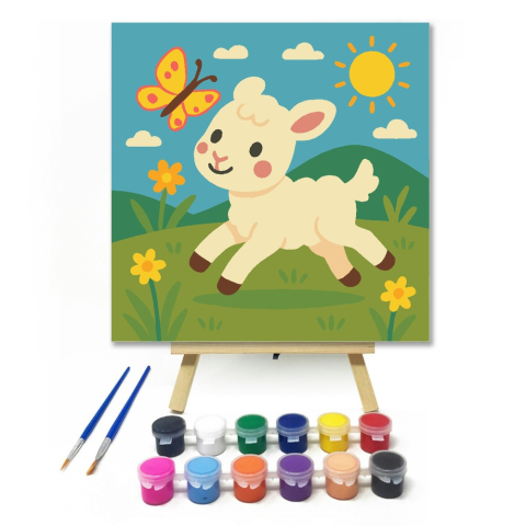 Vidám Bárányka a Rét Közepén - gyerek számfestő készlet – 20×20 cm (Keret nélkül) A kép egy mosolygós báránykát ábrázol, aki vidáman ugrándozik a zöld réten. A napfényes tájat színes virágok és egy játékos pillangó teszi még varázslatosabbá. A barátságos
