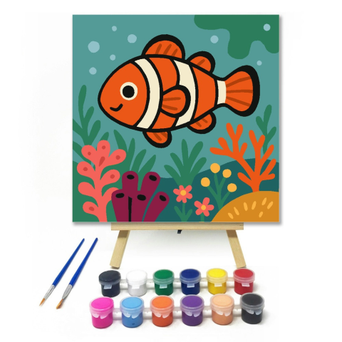 Vidám Bohóchal a Víz Alatt - gyerek számfestő készlet – 20×20 cm (Keret nélkül) A kép egy mosolygós bohóchalat ábrázol, amint a színes korallok között úszkál. A tenger élénk árnyalatai és a barátságos halacska vidám hangulatot teremtenek. Tökéletes válasz