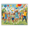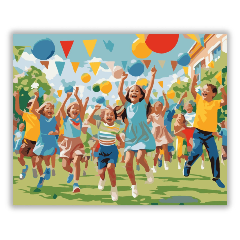 Vidám Iskolai Ünnep Színes Lufikkal - számfestő készlet – 40×50 cm (Keret nélkül) A festmény vidám gyerekeket ábrázol, akik egy tavaszi iskolai ünnepségen táncolnak a játszótéri színpadon, háttérben papírvirágokkal és füzérekkel díszítve. A kép élénk szín