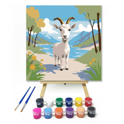 Vidám kecske - gyerek számfestő készlet – 20×20 cm (Keretre feszítve) Ez a kép egy mosolygós kecskét ábrázol, aki boldogan sétál a hegyi ösvényen, körülötte színes virágokkal és csodás tájjal. A ragyogó kék ég és a zöld mezők vidám hangulatot árasztanak.
