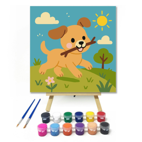 Vidám Kiskutya a Réten - gyerek számfestő készlet – 20×20 cm (Keret nélkül) A kép egy aranyos kiskutyát ábrázol, aki boldogan szaladgál egy réten, botot tartva a szájában. A napfényes égbolt és a zöldellő fű vidám hangulatot árasztanak. Tökéletes választá