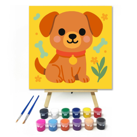 Vidám Kutyus Csontokkal - gyerek számfestő készlet – 20×20 cm (Keretre feszítve) Ez a kép egy mosolygós kutyust ábrázol, aki boldogan ül a csontok között. A meleg színek és barátságos hangulat biztosan mosolyt csalnak minden gyermek arcára. Tökéletes vála