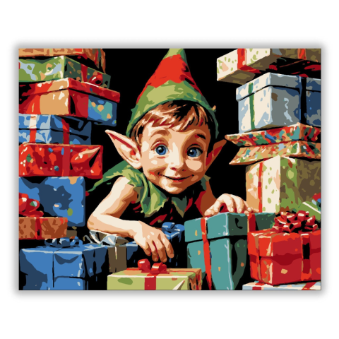 Vidám Manó Ünnepi Kaland - számfestő készlet – 40×50 cm (Keret nélkül) A képen egy vidám kis manó örömteli arccal bújik meg a színesen csomagolt ajándékok között. A háttér meleg, ünnepi hangulatot varázsol, a különböző színek és formák vibráló kavalkádjáv