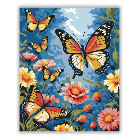 Vidám Pillangók Virágos Kertben - számfestő készlet – 40×50 cm (Keret nélkül) A festmény különböző színpompás pillangókat ábrázol, amint egy virágos kertben repkednek. Az élénk piros, sárga és narancssárga színek vidám és élettel teli hangulatot teremtene